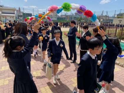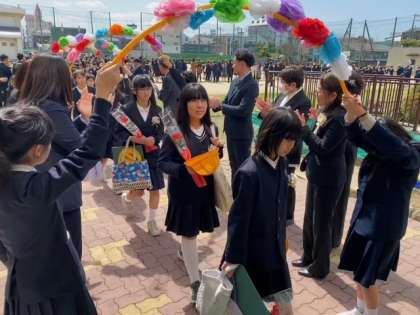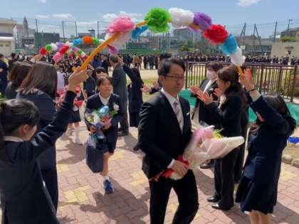 卒業生が、担任の先生の先導で、在校生・保護者・来賓・教職員がつくる「花道」を歩いています。