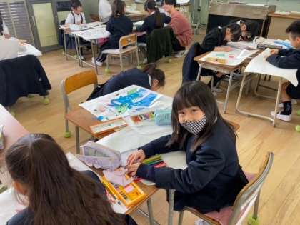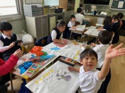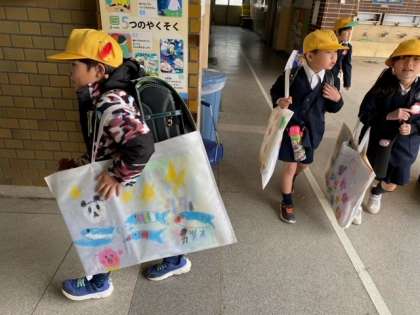 1組の図画工作科の時間に、子どもたちが、作品袋に好きな絵を描いていました。