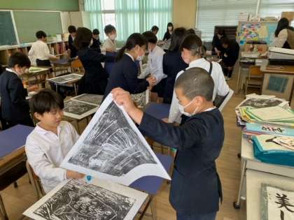 2組では、完成した「版画」を色画用紙に貼っていました。