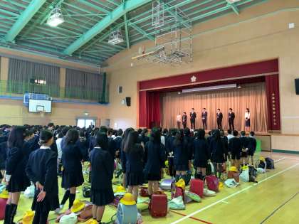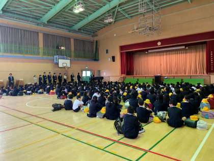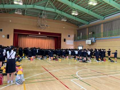 2年生から6年生の児童が、講堂に旧クラスで集合しました。(1年生は教室です。)