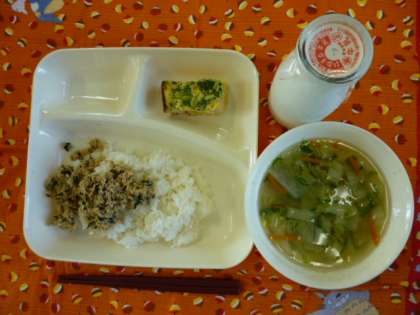 千草焼き、すまし汁、ツナっ葉いため、ご飯、牛乳