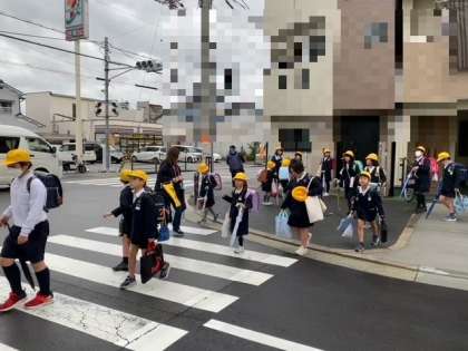 まだ少し緊張感が残る中、子どもたちが元気に集団登校しています。
