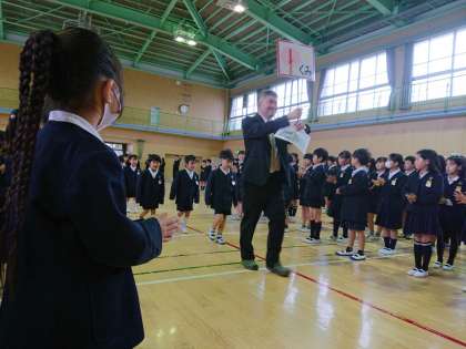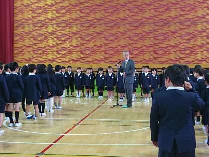 今日の対面式で、1年生の児童が 2〜6年生のお兄さんお姉さんと初めて顔を合わせました。