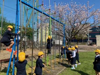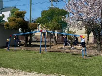 まだ桜が咲く 校庭の「遊具」で、1年生の子どもたちが、楽しそうに遊んでいます。