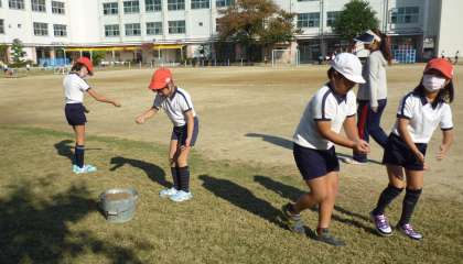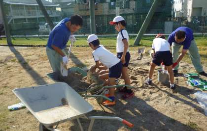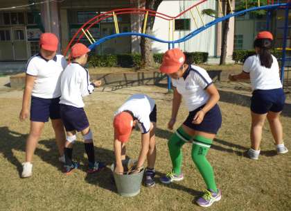 今日は暑くて、4年生は汗をいっぱいかきながらも、何度もバケツを運び、砂と種をまいてくれました。2週間ほどで、芽が出てくるそうです。
