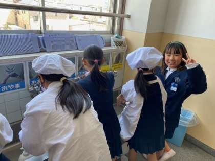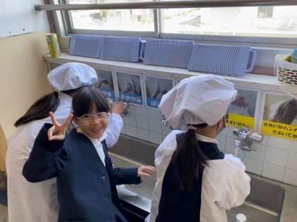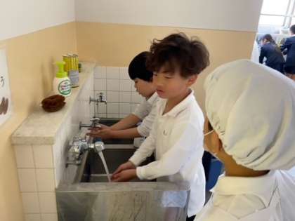 給食を食べる前に、子どもたちが、しっかりと手を洗っています。