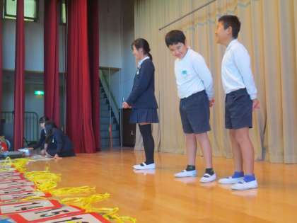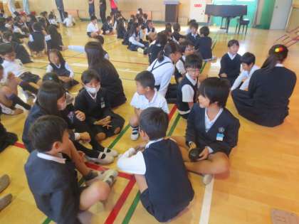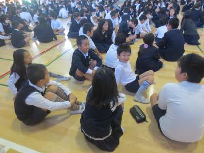 今日の児童集会は「イントロクイズ」です。集会委員会の児童が説明をしてからゲームがはじまりました。