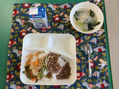 牛ひき肉・豚ひき肉をにんにく、ごま油の風味で甘辛くいためたものと、きゅうり、にんじん、切り干しだいこんを味付けしたものをご飯の上にのせて食べます。