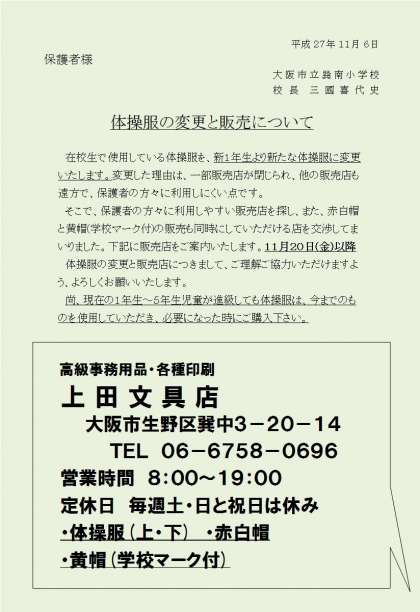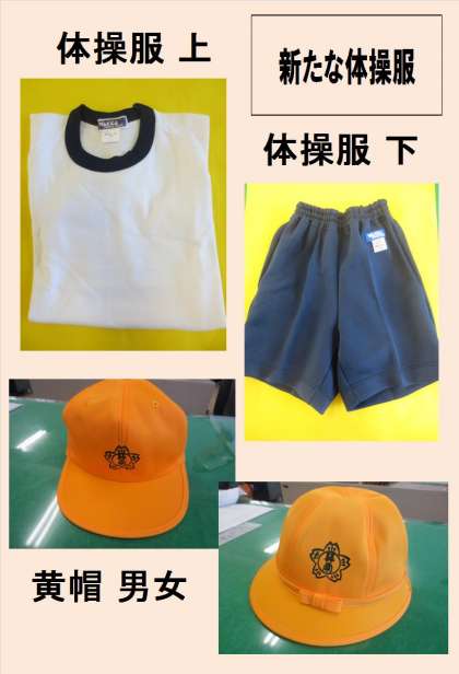 体操服の変更理由及び黄帽・赤白帽・標準服などの販売店については、右の配布文書「お知らせ」に詳しく載せています。ご覧ください。