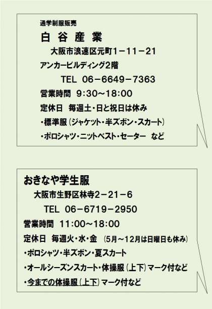 尚、標準服につきましては、今まで通り「白谷産業」06-6646-7363浪速区元町と「おきなや学生服」06-6719-2950生野区林寺で販売しております。