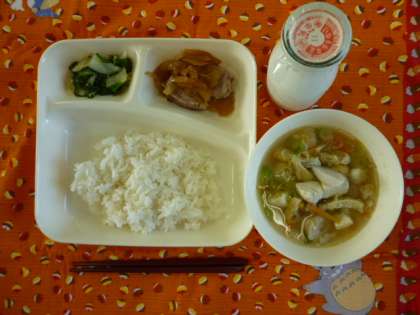 豚肉のしょうがじょうゆかけ、けんちん汁、おおさかしろなのごまあえ、ご飯、牛乳