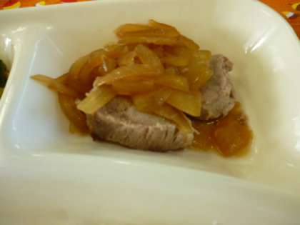 角切りの豚肉を焼き、たまねぎをいためてしょうがじょうゆで味付けしたものをかけま