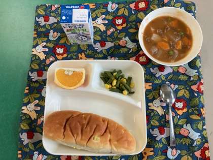 ビーフシチュー、さんどまめとコーンのサラダ、あまなつかん、パン、牛乳