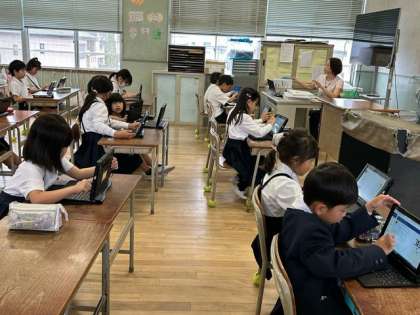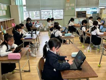 子どもたちが、楽しそうにキーボードやマウスを操作しています。