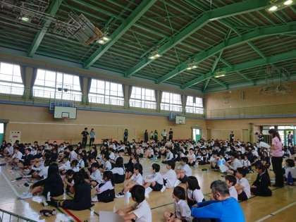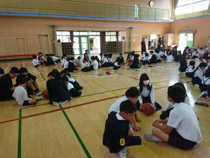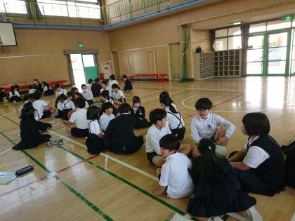 体育館に移動して、班ごとに「自己紹介ゲーム」を通して交流しました。