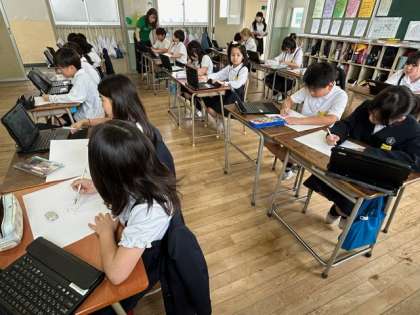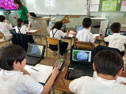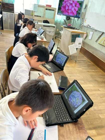 子どもたちが、「アジサイ(紫陽花)」を描いています。