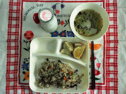 もずくと豚ひき肉のジューシー、五目汁、焼きさつまいもの