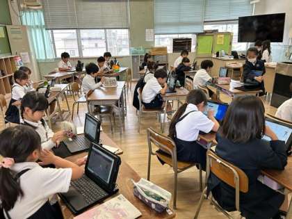2年生の子どもたちがタブレット端末で「心の天気」を入力した後、学習アプリで漢字や計算などに取り組んでいます。