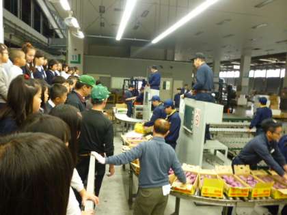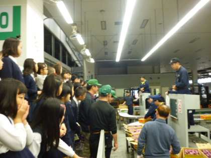東部市場では、青果・水産物・加工食品を取り扱っています。今日は、青果のセリの様子を特別に見学することができました。あっという間に、値段と買取業者が決まっていきました。