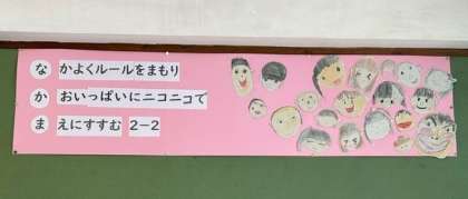 2組「なかよくルールをまもり かおいっぱいニコニコで まえにすすむ2年2組」 です。