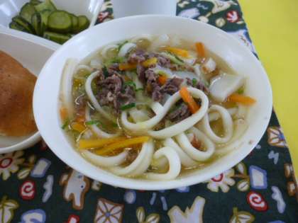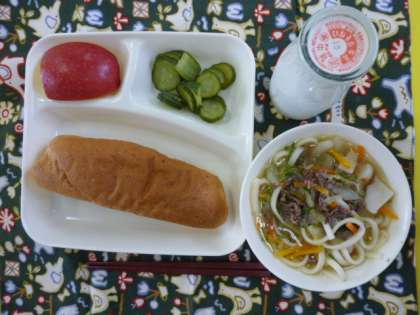 肉うどん、きゅうりの甘酢づけ、りんご、ライ麦パン、牛乳