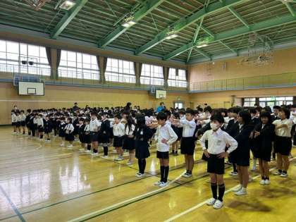 子どもたちが、講堂に集合し、きれいに整列しています。