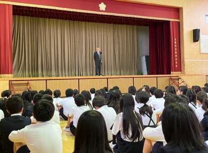 校長先生と元気よく朝のあいさつをして、話を聞きました。