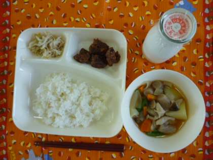 くじらのオーロラ煮、じゃがいもと野菜の煮もの、もやしのゆずの香あえ、ご飯、牛乳