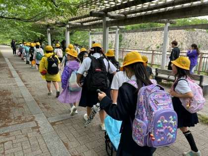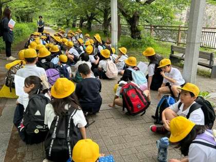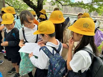 4年生と3年生が協力してポイントを回ります。地図でポイントを確認しています。