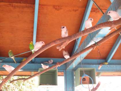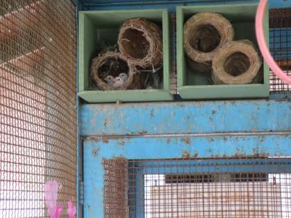 わらでできた巣に十姉妹はたまごを生み育てます。チャボやインコともなかよく鳥小屋で暮らし、それぞれになかまを増やしています。