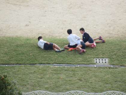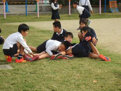 高学年の児童が芝生の上で、ごろごろとしていました。取っ組み合ったり、寝転んだりしてのんびりと休み時間をすごしていました。