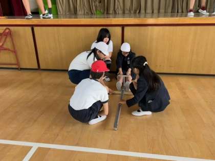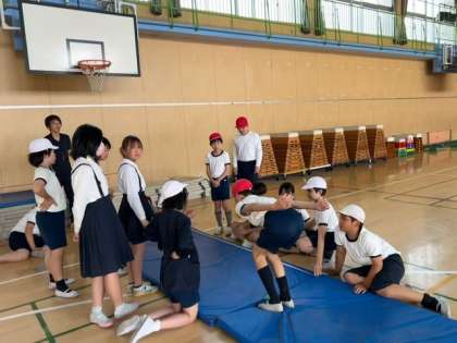 1組の子どもたちが、体育館で「立ち幅跳び」と「長座体前屈」に挑戦していました。