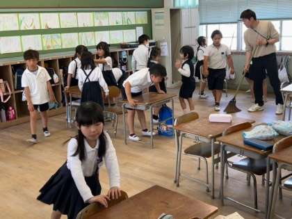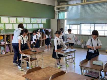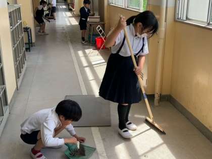 子どもたちと先生が、一緒になって、教室や廊下をきれいに掃いていました。