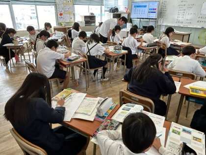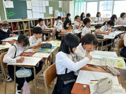 子どもたちが、主な山地山脈・河川・平野などを、地図帳で調べ、白地図に書く作業をしました。