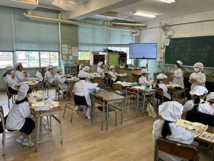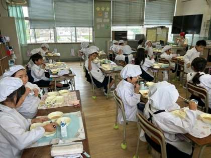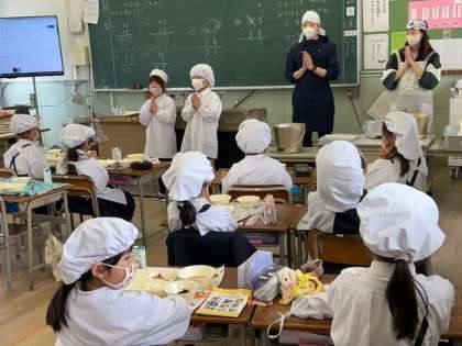 当番児童がお行儀よく並び、手を合わせて「いただきます」とあいさつをしています。