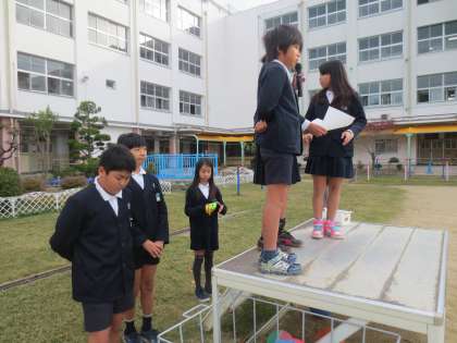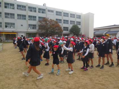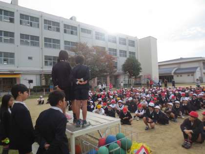 集会委員会の児童が説明をしています。さあっ!「ボール送り」ゲームがはじまりました。