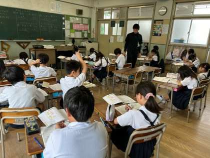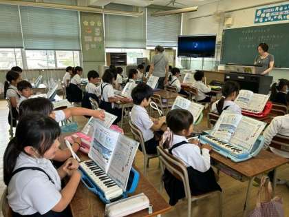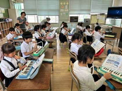 1組の音楽科では、「ぷっかり くじら」の曲を、音楽の感じを生かし、音の高さの違いに注目して、歌ったり鍵盤ハーモニカで吹いたりしました。