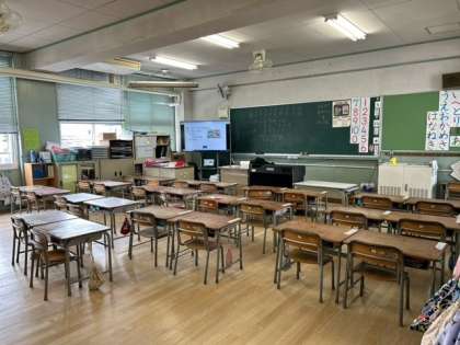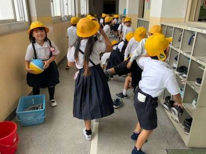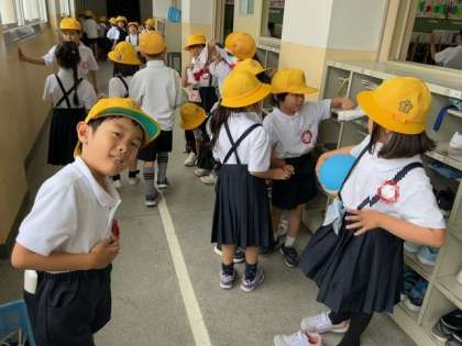 1年生の子どもたちが、いっせいに教室から廊下に出て、下靴に履きかえています。