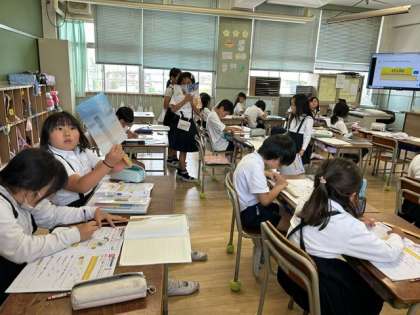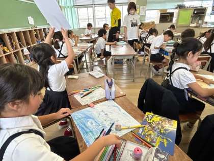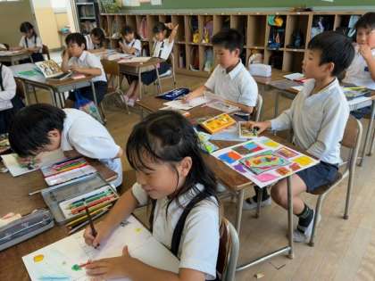 2組の図画工作科では、子どもたちが、好きな絵を描いたオリジナルのハンカチをつくっていました。