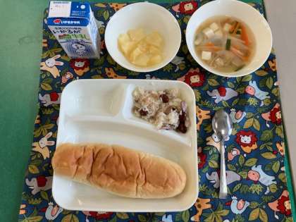 金時豆の中華おこわ、中華スープ、パインアップル(缶)、パン、牛乳