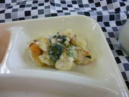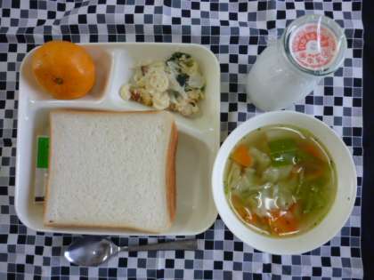 スープ煮、ほうれん草のグラタン、みかん、食パン、マーガリン、牛乳