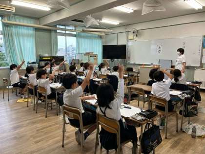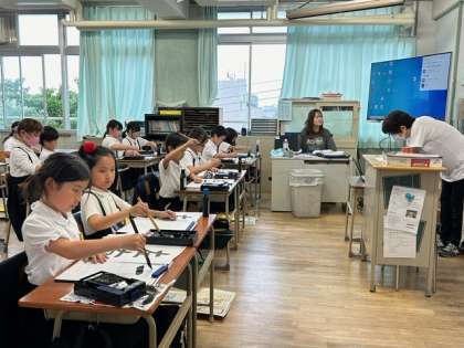背筋を伸ばし、筆を立てて、いい姿勢で書いています。