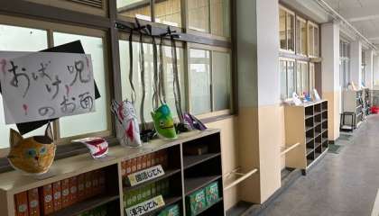 3年生の子どもたちの作品「おばけのお面」が廊下に展示されています。
