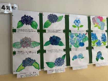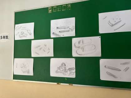 5年生の学年掲示板には、筆記具や靴など身近なものを題材にデッサンした作品が掲示されています。