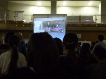 「開会式の前に、ハイポーズ!」開会式後、C−NETの皆さんが作った英語に親しむラジオ体操の映像に合わせて準備運動をしました。