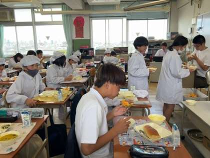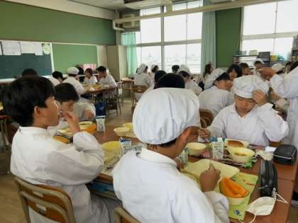 よい姿勢で、好き嫌いしないで、食器を持って、マナーよく食べています。