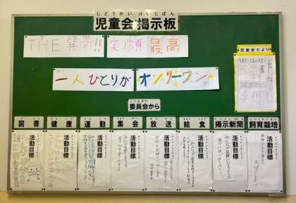 児童会掲示板に、児童会だよりと児童会目標が掲示されています。