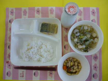 さごしのおろしじょうゆかけ、すまし汁、五目豆、ご飯、牛乳
