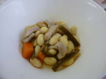 鶏肉、大豆、れんこん、にんじん、こんぶを砂糖、みりん、しょうゆで煮こんでいます。