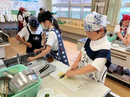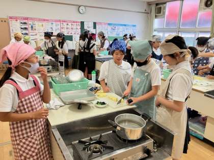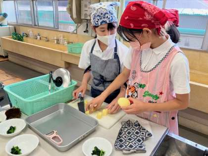 子どもたちが、班で協力して「たまご」「じゃがいも」「ほうれん草」をゆでました。